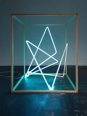 In direkter Auseinandersetzung mit Mosleys „Schattengerüsten“, die materiell sehr zurückhaltend den Schatten auf der Wand zum eigentlichen Bild erheben, erarbeitete Antje Blumenstein für die gemeinsame Ausstellung eine ortsspezifische Installation aus farbigen Acrylglasplatten, die unzählige Durchblicke, Farbmischungen und Lichteffekte erzeugt. Ihre großformatige, leuchtende Neonskulptur „three lines eight corners 01“ hinter der ebenerdigen Glasfassade des RAUM SCHROTH lohnt einen Gang zum Museum auch außerhalb der Öffnungszeiten bei Dunkelheit.