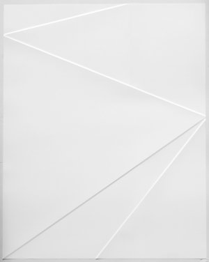 Im RAUM SCHROTH werden neben leuchtenden Installationen und Wandobjekten auch Papierarbeiten gezeigt, die sowohl in Antje Blumensteins als auch in Tom Mosleys Schaffen einen zentralen Platz einnehmen. Das lichte Material nutzen beide für reduzierte plastische Werke, in denen der Schatten lineare Strukturen betont oder malerisch nuanciert im Raum aufgeht. So zeigt Antje Blumenstein gefalzte Papierarbeiten aus ihren Werkgruppen „lines“ und „cross“ im Kontext mit