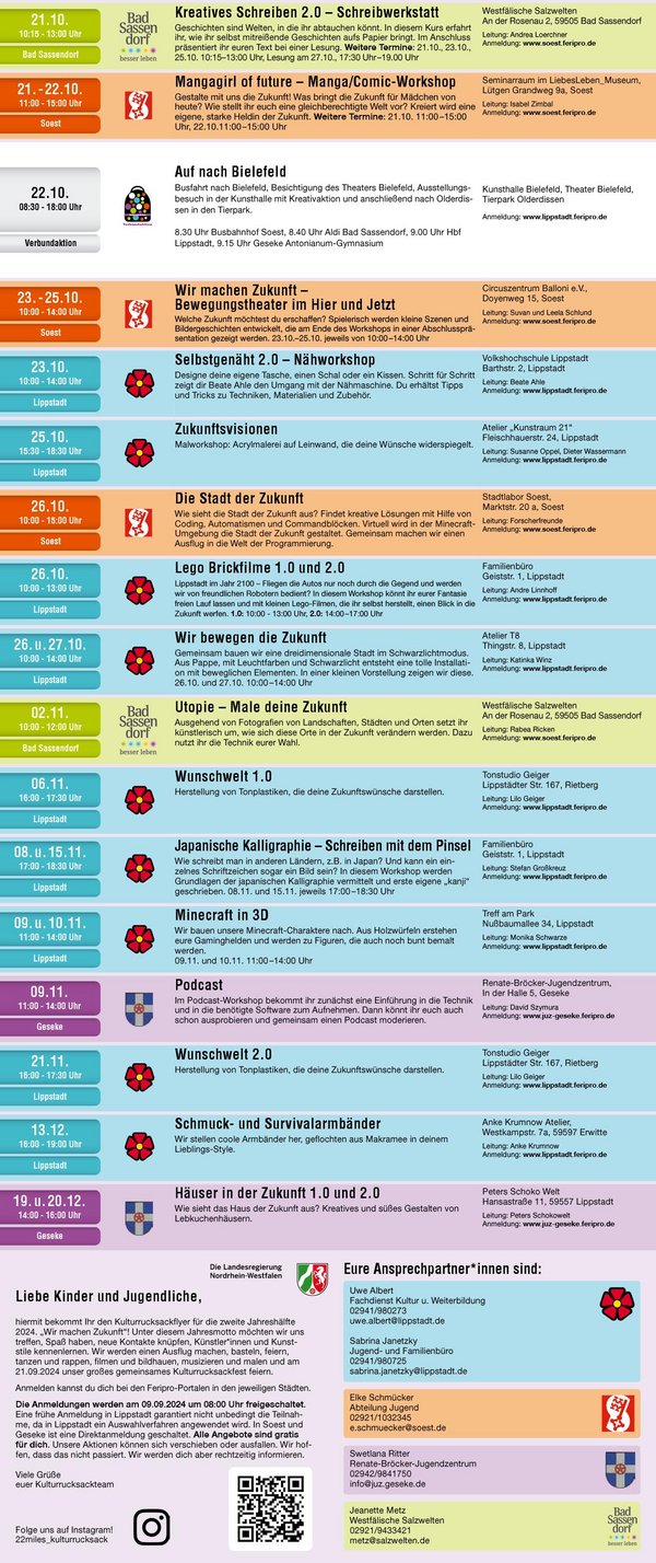 Der Kulturrucksack geht unter dem Motto „Wir machen Zukunft“ in die nächste Runde und die Anmeldung startet am 09. September 2024 unter www.soest.feripro.de.