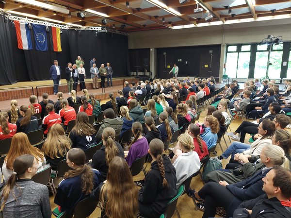 Neben den insgesamt 14 Basketball-, Fußball-, Handball-, Hockey- und Volleyball-Teams konnte Bürgermeister Dr. Eckhard Ruthemeyer auch seinen niederländischen Amtskollegen Rob Metz in der Aula des Schulzentrums begrüßen.