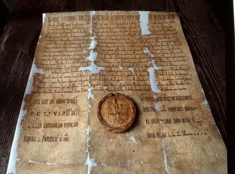 Die älteste bis heute in Soest verwahrte Urkunde von 1166. Inhalt: Erzbischof Rainald von Dassel überlässt dem St.-Patrokli-Stift ein Waldstück