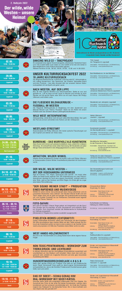 Das Programm des 2. Halbjahres vor Ort ist wieder im Städteverbund Soest, Lippstadt und Bad Sassendorf sowie Geseke entstanden. Die zentrale Übersichts- und Anmeldeplattform ist online unter www.soest.feripro.de zu finden. Darüber hinaus liegen an vielen Stellen im Soester Stadtgebiet auch die Proramm-Flyer mit weitergehenden Informationen aus.