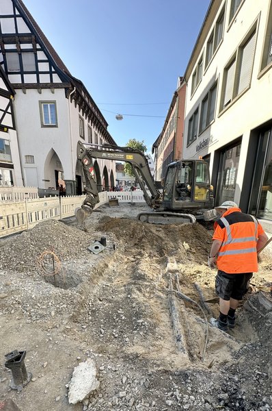 Die Arbeiten wechseln nun wie geplant auf die andere, westliche Straßenseite zwischen Postgasse und Gremlich-Passage. Hier werden in einem ersten Schritt vorhandene Leitungen umgelegt, damit im Untergrund Platz für den Einbau einer Wurzelkammer für einen Baum neuen entsteht.