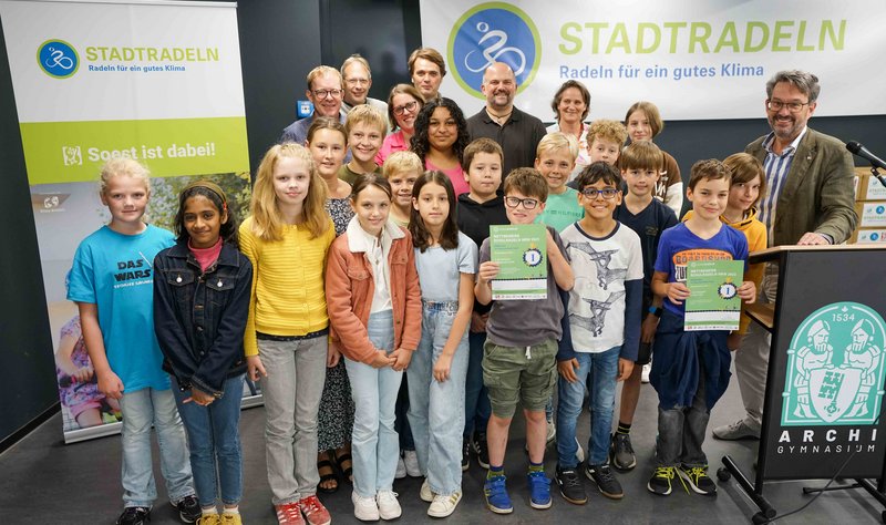 Eigens für die Schulen gibt es beim „Stadtradeln“ den Unterwettbewerb „Schulradeln“. Er soll Schülerinnen und Schüler noch einmal ganz besonders zum Radfahren im Sinne einer klimafreundlichen und eigenständigen Mobilität motivieren. In Soest hatten sich elf Schulen am „Schulradeln“ beteiligt. Das Archigymnasium landete sogar mit einer Kilometerzahl von 37.478 Kilometern und einer Anzahl von 263 aktiven Radelnden auf Platz eins aller Teams im gesamten Kreis Soest. Aus diesem Grund war das Archigymnasium auch Veranstaltungsort der Siegerehrung.