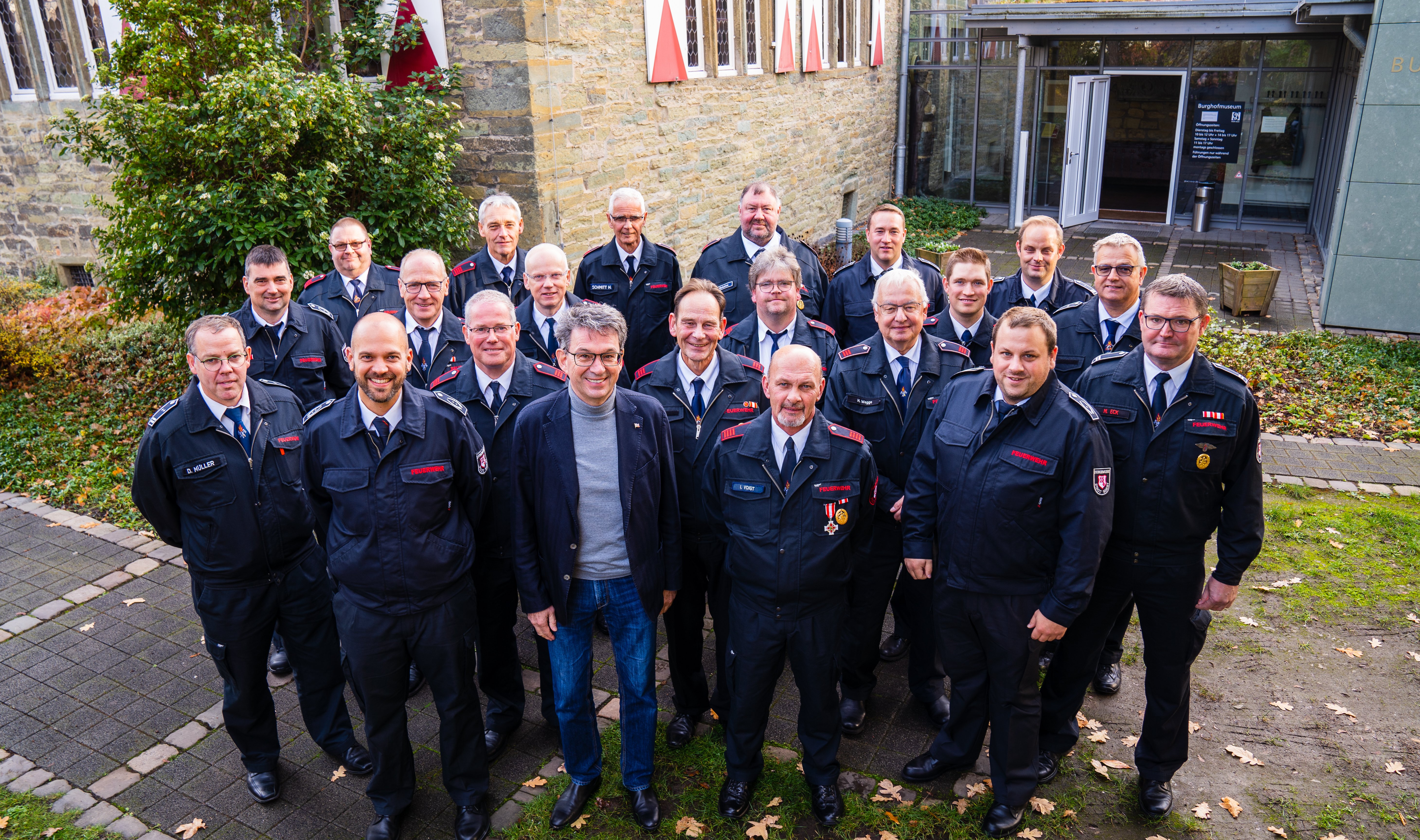 Bürgermeister Dr. Eckhard Ruthemeyer und Feuerwehrleiter Christoph Blume haben 19 Männer aus dem aktiven Dienst in die Ehrenabteilung der Soester…