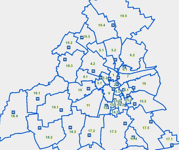 Über den untenstehenden Link gelangen Sie zu einer Kartenübersicht mit Informationen zu den Wahlbezirken und Wahllokalen. Über die Eingabe Ihrer Adresse können Sie sich den zugehörigen Wahlbezirk anzeigen lassen. Wahllokale im Bezirk sind über ein blaues Symbol mit einem W markiert.