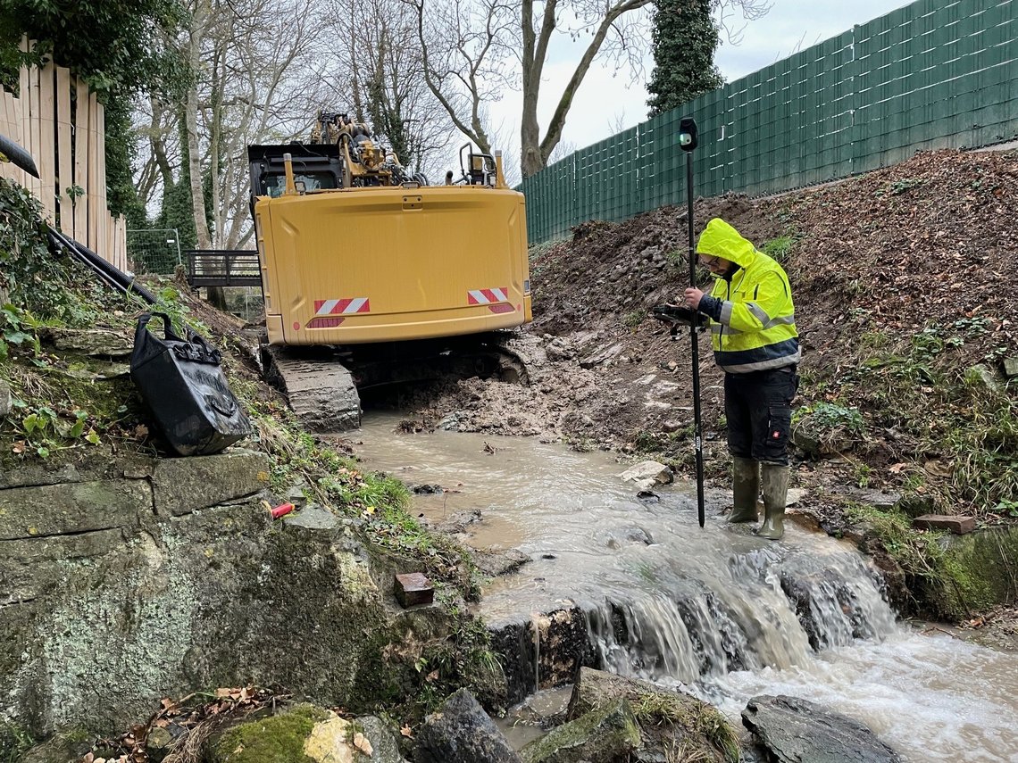 Auf dem Gelände des Klosters Paradiese wird der Amper Bach renaturiert. Dafür sind Bodeneingriffe erforderlich, die archäologisch begleitet werden. Außerdem muss ein Teil des Denkmals, ein Querbauwerk der Mühle im Bachbett, zurück gebaut werden. Damit die Informationen über das Bauwerk zumindest in Sekundärquellen erhalten bleiben, hat die Stadtarchäologie die Steinsetzungen eingemessen und fotogrammetrisch nachgehalten.